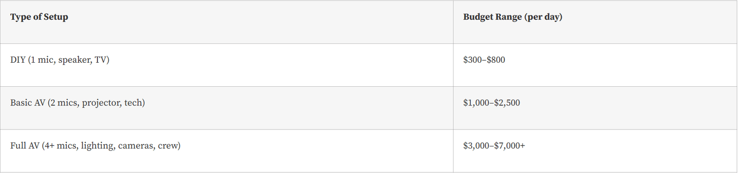 Pro Tip: Get multiple AV quotes—don’t just default to the venue’s in-house team. Independent AV vendors are often more flexible and budget-friendly.